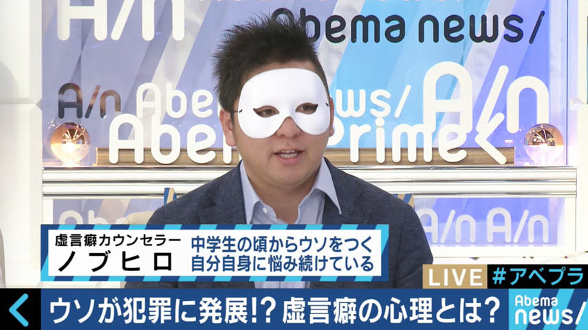 虚言癖で悩む人にノブヒロさんは「自分の現状を知ることが大事なので、普段ついてしまっている嘘をノートに書き出して、自分はこんな嘘をついているんだと自覚することが最初。どうしても自分を責めがちだが、まずは自分の現状を把握するためにもその感情を置いて、整理していくことが大事」と訴えた。(AbemaTV/『AbemaPrime』より)