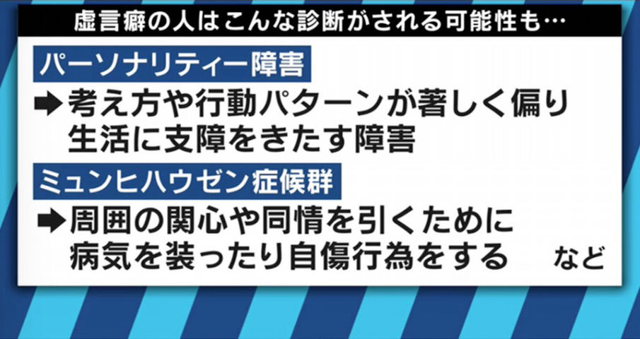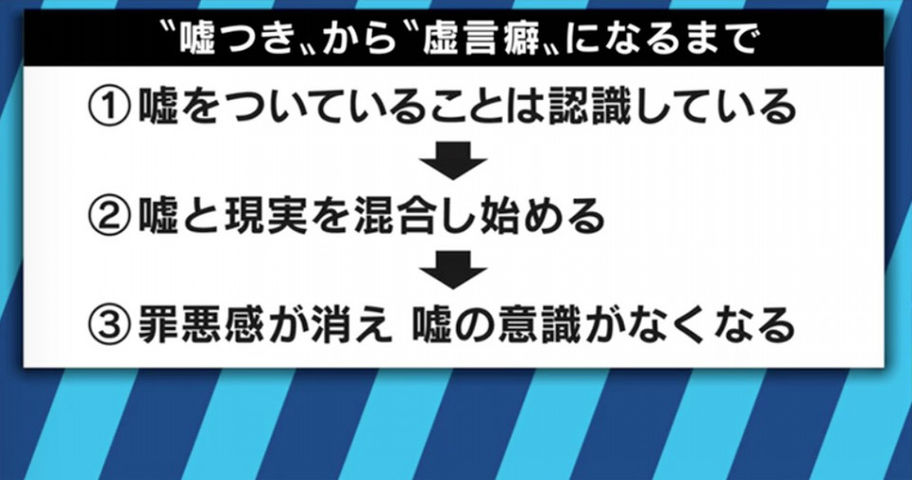 繰り返し嘘をつく人は、"虚言癖"と言われることもある。明星大学心理学部の藤井靖准教授によると、虚言癖は幼少期から始まっていることが多く、空想と現実の世界が分からなくなる。嘘発見器で調べても脳の動きなど嘘をついている時の反応が出ないという。また、その場の雰囲気を潤滑にする方便としての嘘と、犯罪にまで繋がってしまうような虚言癖との間には明確な線引きがされるという。