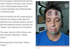 先月27日の夜11時頃、休暇でカンボジアを訪れていた英国人男性ポール・フェレルさん(Paul Ferrell、32)はシアヌークビル広場のバーで飲み物を注文した。その時に被っていた帽子を取ったが、その額には「臺灣(台湾)」の文字タトゥーが大きく彫られていた。